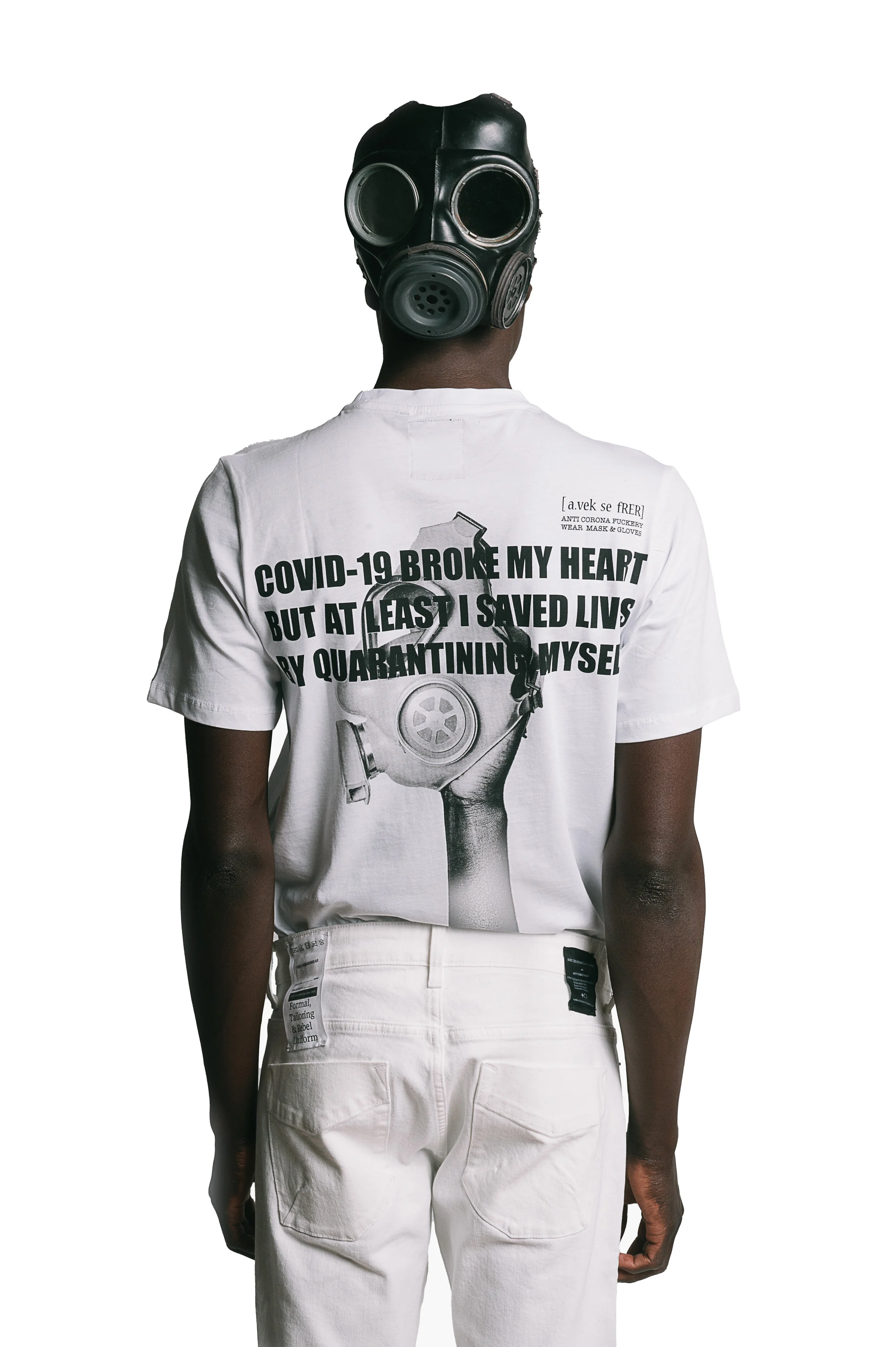 This collection features stand out graphics on vintage t-shirts and long sleeved sweatshirts, with slogans such as ‘Anti-Capitalist Fashion’ and ‘F*ck Racism’. While addressing the issue of racism, this collection also focuses on the importance of social distancing and quarantining, showcasing reversible face masks and shirts reading, “Covid-19 Broke My Heart but at Least I Saved Lives By Quarantining Myself.”
